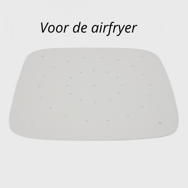 Plaats het bakpapier op de bodem van het mandje. Dit houdt de airfryer schoon en voorkomt aankleven. De perforaties zorgen ervoor dat de hete lucht goed door het mandje kan stromen en de gerechten krokant worden.