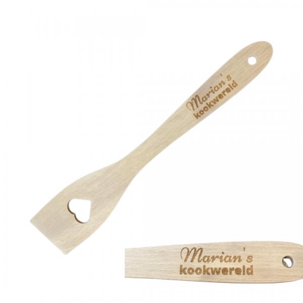 Houten keukenspatel met een hartvormige uitsparing in het brede gedeelte. Met Marian’s Kookwereld logo