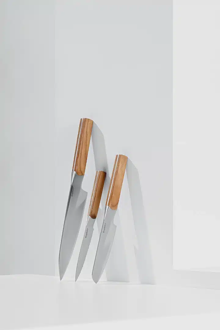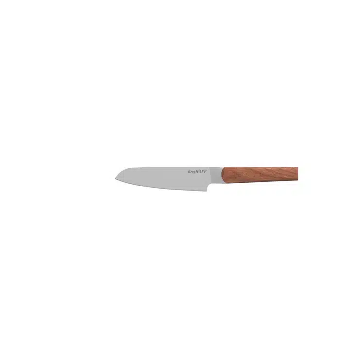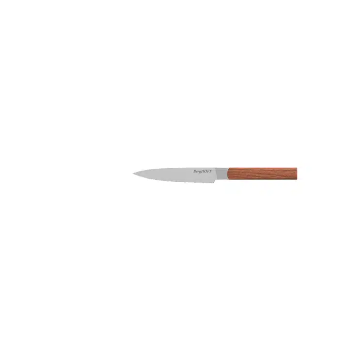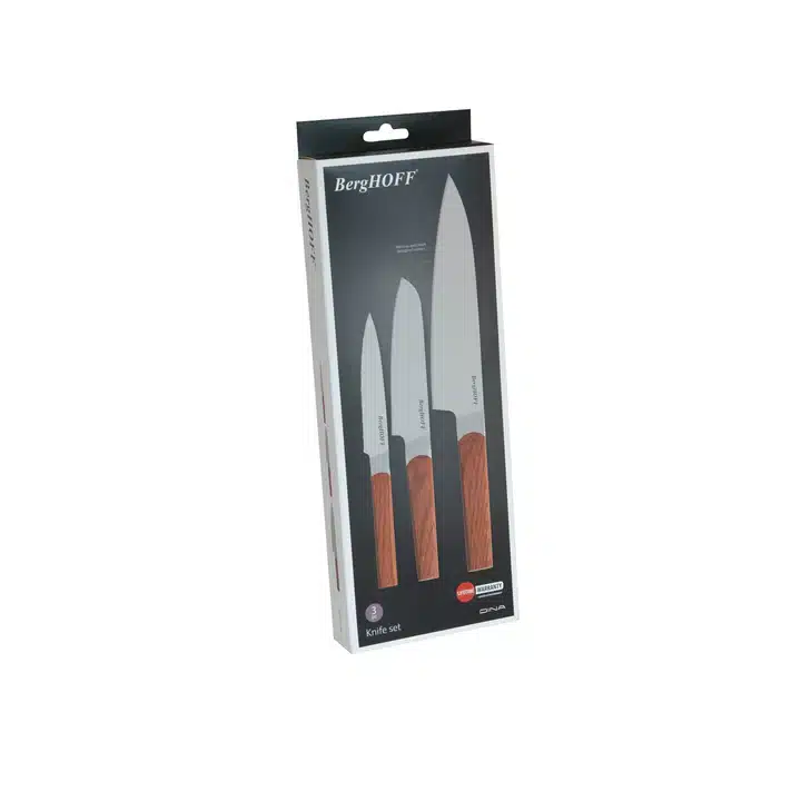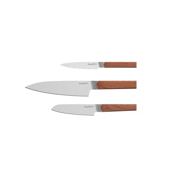 Deze 3-delige set bestaat uit een gekarteld universeel mes, een koksmes en een santoku mes, de perfecte startersset in je keuken! Het allrounder koksmes is voor het snijden en in blokjes snijden, het gekartelde universeel mes snijdt perfect voedsel met een harde buitenkant en zachte binnenkant en het santoku mes is perfect voor het hakken, snijden en in blokjes snijden van ingrediënten. De stijlvolle houten handgrepen met satijnen afwerking geven je een veilige en comfortabele grip, terwijl ze die extra glamour toevoegen waar je naar op zoek bent!