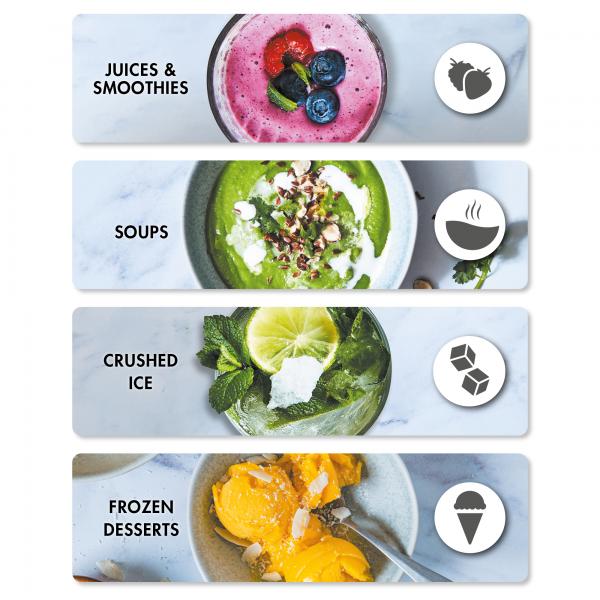 - Cocktails, milkshakes, smoothies, soepen, notenpasta’s, beslag, snelle sorbets en ijsdrankjes.