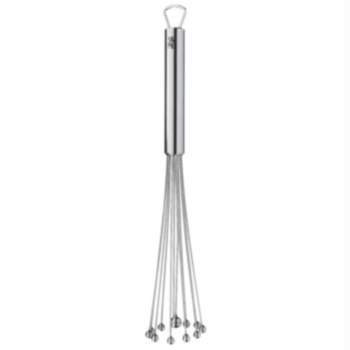 Maak kennis met de garde die alles net even beter doet: de WMF bolletjesgarde. Dankzij het innovatieve ontwerp met flexibele staafjes en kleine roestvrijstalen balletjes roer je moeiteloos door sauzen, dressings, marinades en slagroom. De balletjes zorgen voor een unieke klopbeweging en bereiken moeiteloos elk hoekje van je pan of kom – niets blijft meer hangen.