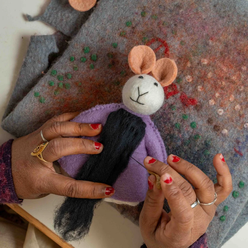 Vilten muis als Piet in een lila jasje, mét de zak van Sinterklaas op z’n rug. Perfect te combineren met de Sintermuis en het paard voor een sfeervol sinterhoekje. Gebruik ‘m als eiwarmer of laat hem tot leven komen als handpop voor kleine handjes!