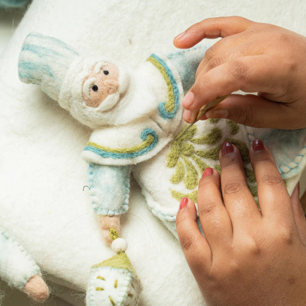 Vilten winterkoning in zachte tinten groen en wit, met verfijnde details en een lantaarn in de hand. Een sfeervolle toevoeging aan je winterdecoratie.