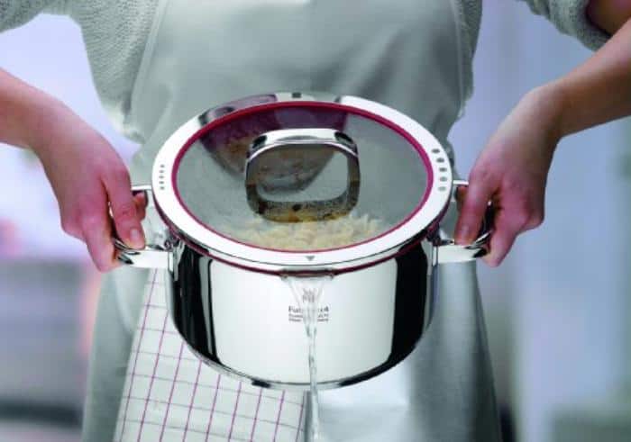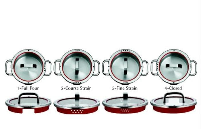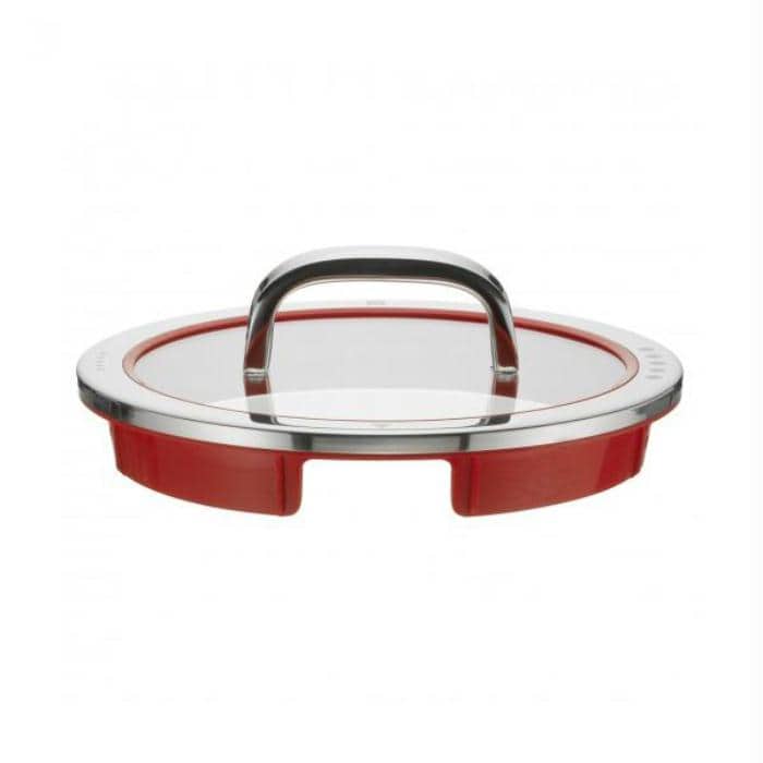 Koken wordt een stuk makkelijker met de WMF Function 4 glazen deksel. Dankzij de vier verschillende afgietstanden giet je water of bouillon af zoals jij wilt: via kleine gaatjes voor bijvoorbeeld rijst, of via grote gaten voor pasta en groenten. De rode siliconen ring is hittebestendig en zorgt dat de deksel stevig op de pan blijft zitten.