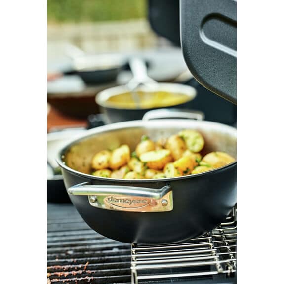 Wat is er heerlijker dan een pruttelend stoofpotje delen onder een flonkerende sterrenhemel? De Black 5 sudderpot is jouw stoere kooktool. Superstoer in een mat zwarte kleur. Hij verdraagt tot 400 graden. Likken er vlammen aan de keramische coating? Dat geeft hem alleen maar extra karakter. Het hoogwaardige roestvrije staal en de speciale constructie uit 5 lagen zorgt voor optimale hitteverdeling. Zo laat je kippenboutjes, stoofvlees, kikkererwten, paprika’s en ander dankbare ingrediënten moeiteloos tot hun recht komen. Ook op een gasbarbecue of gewoon op de inductieplaat. De grote grepen van de Black 5 reeks van Demeyere geven je extra vertrouwen en zijn aangepast aan het gebruik van dikke vuurvaste wanten. Geen risico’s dus, enkel de pret van het culinaire buitenleven. Klaar? De vaatwasser doet de rest.