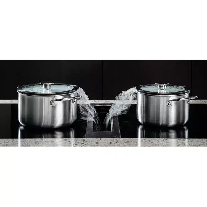 Steeds meer keukens zijn uitgerust met kookplaatafzuiging: het afzuigsysteem zit ín de kookplaat en niet in een afzuigunit aan het plafond of de wand. Bij dit zogenaamde downdraft-systeem worden kookluchtjes en condens dus naar beneden in plaats van naar boven afgezogen – en dat vraagt om andere pannen. Of beter gezegd, om andere deksels. Bij traditionele deksels zit het stoomgat aan de bovenkant (logisch wanneer condens ook naar boven toe afgezogen wordt), maar wanneer de afzuiging in de kookplaat zit, is dit niet de juiste plek.