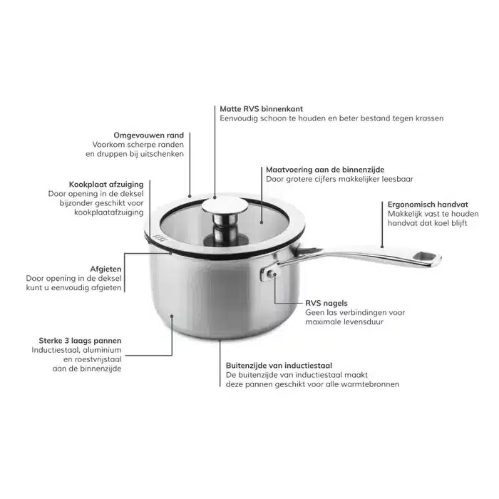 Met deze vijfdelige set heb je een mooie basis set rvs pannen in huis die geschikt zijn voor kookplaatafzuiging (downdraft). In de vier hoge pannen (Ø 16cm, Ø 18cm, Ø 20cm en Ø 24cm) kook je bijvoorbeeld groenten, pasta of rijst. Voor het bereiden van sauzen of voor het koken van een eitje, kun je de steelpan (Ø 16cm) heel goed gebruiken. De unieke siliconen ring in de deksel zorgt er tijdens het koken voor dat deze goed op zijn plaats blijft én dat de condens in de pan via de uitsparing aan de zijkant wordt afgezogen.