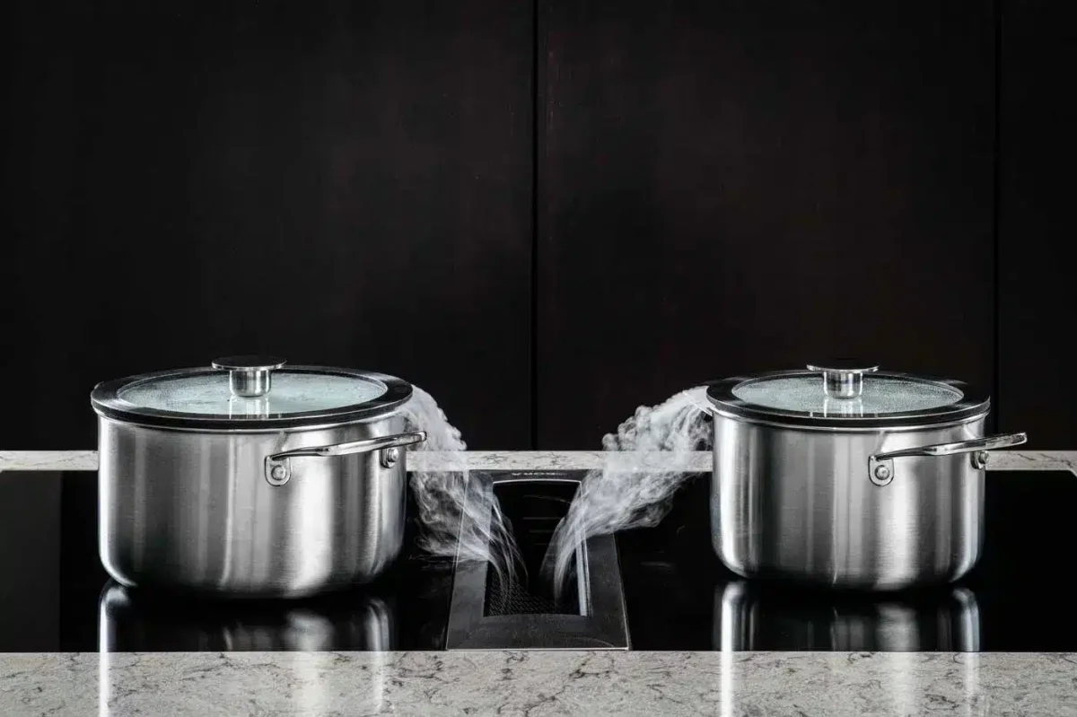 Met deze 6 delige set heb je een mooie set rvs pannen plus koekenpannen in huis die geschikt zijn voor kookplaatafzuiging (downdraft). De gehele serie is gemaakt van tri-ply materiaal hetgeen betekend dat de geleiding ook in de wanden van de pan zit. Tri-ply zorgt er dan ook voor dat je een super rendement uit je kookplaat kan halen waardoor je tijd, doordat het sneller kookt en energie bespaart. Omdat tri-ply warmte vasthoudt kun je er ook nog eens op een lagere stand mee werken, dat is wel zo voordelig in energieverbruik. In de vier hoge pannen (Ø 16cm, Ø 18cm, Ø 20cm en Ø 24cm) kook je bijvoorbeeld groenten, pasta of rijst. Voor het bereiden van sauzen of voor het koken van een eitje, kun je de steelpan (Ø 16cm) heel goed gebruiken. Voor het braden van een mooi stuk vlees of vis gebruik je de hapjespan van Ø 26cm. De unieke siliconen ring in de deksel zorgt er tijdens het koken voor dat deze goed op zijn plaats blijft én dat de condens in de pan via de uitsparing aan de zijkant wordt afgezogen.