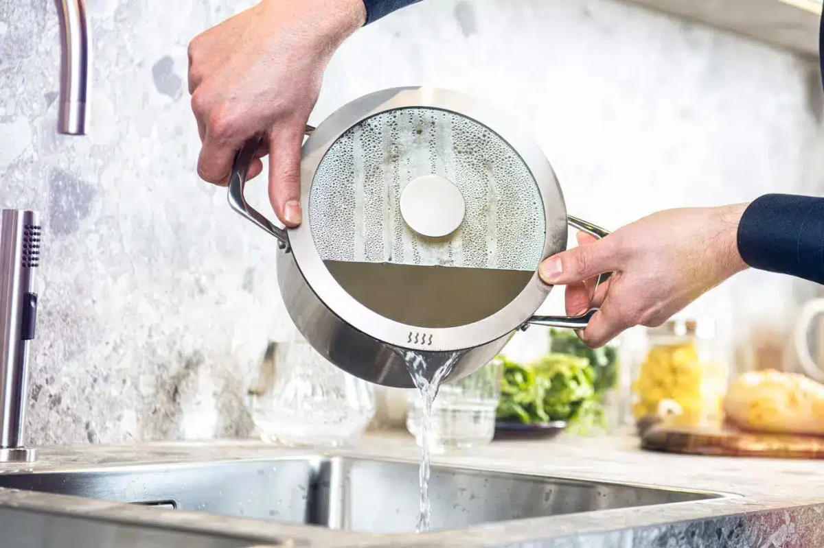 Nog een voordeel: dankzij deze uitsparing wordt afgieten nog gemakkelijker. Omdat de handvatten slechts op twee kleine punten contact maken met de pan, kun je ze zonder pannenlap vastpakken – en dat is wel zo fijn bij het afgieten. Nog een mooi gegeven is dat je de pannen kunt afgieten zonder dat je de deksel er schuin op hoeft te leggen.