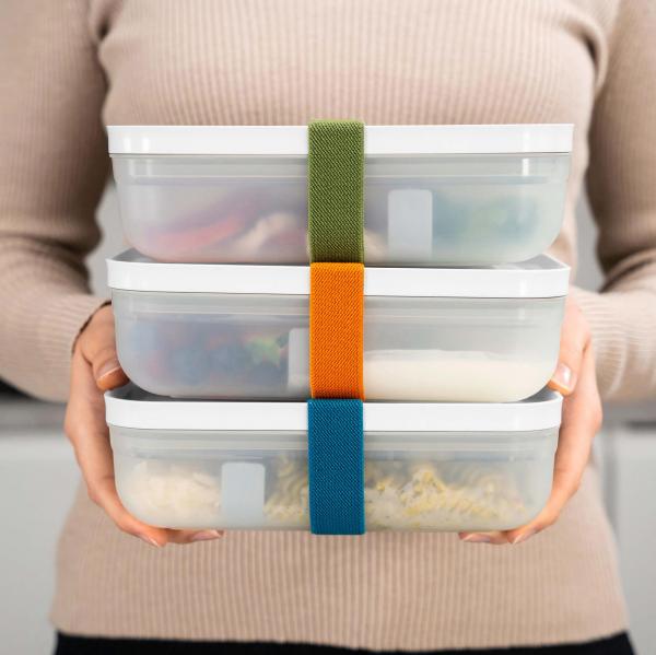 Na het thuis bereiden van een maaltijd met de vacuümpomp is het niet altijd mogelijk om de vacuümbox opnieuw af te sluiten op kantoor of op school. Dit is precies waar onze elastische banden voor zijn ontworpen. Ze houden het deksel op zijn plaats en zorgen voor een betrouwbare sluiting, ook zonder vacuüm. Plaats eenvoudig één van de drie banden in de kleur van uw keuze om het deksel van de vacuümbox stevig op zijn plaats te houden. Kruimels blijven in de doos en je tas blijft schoon.