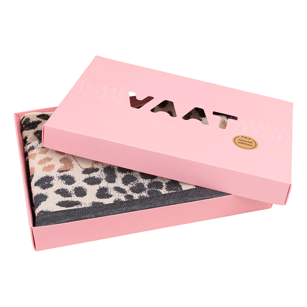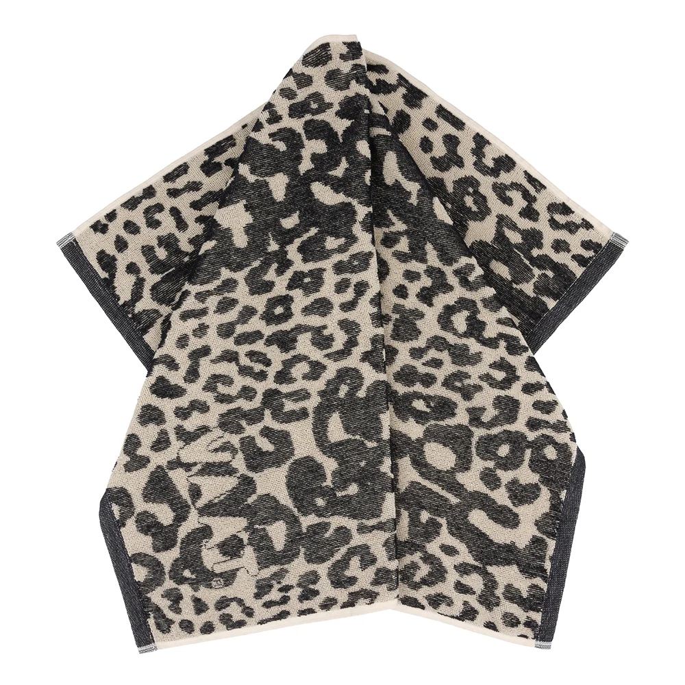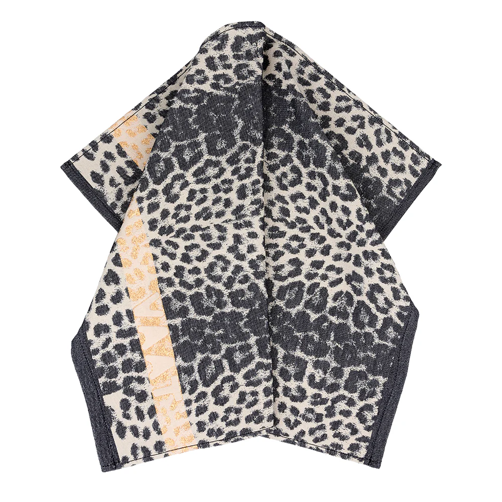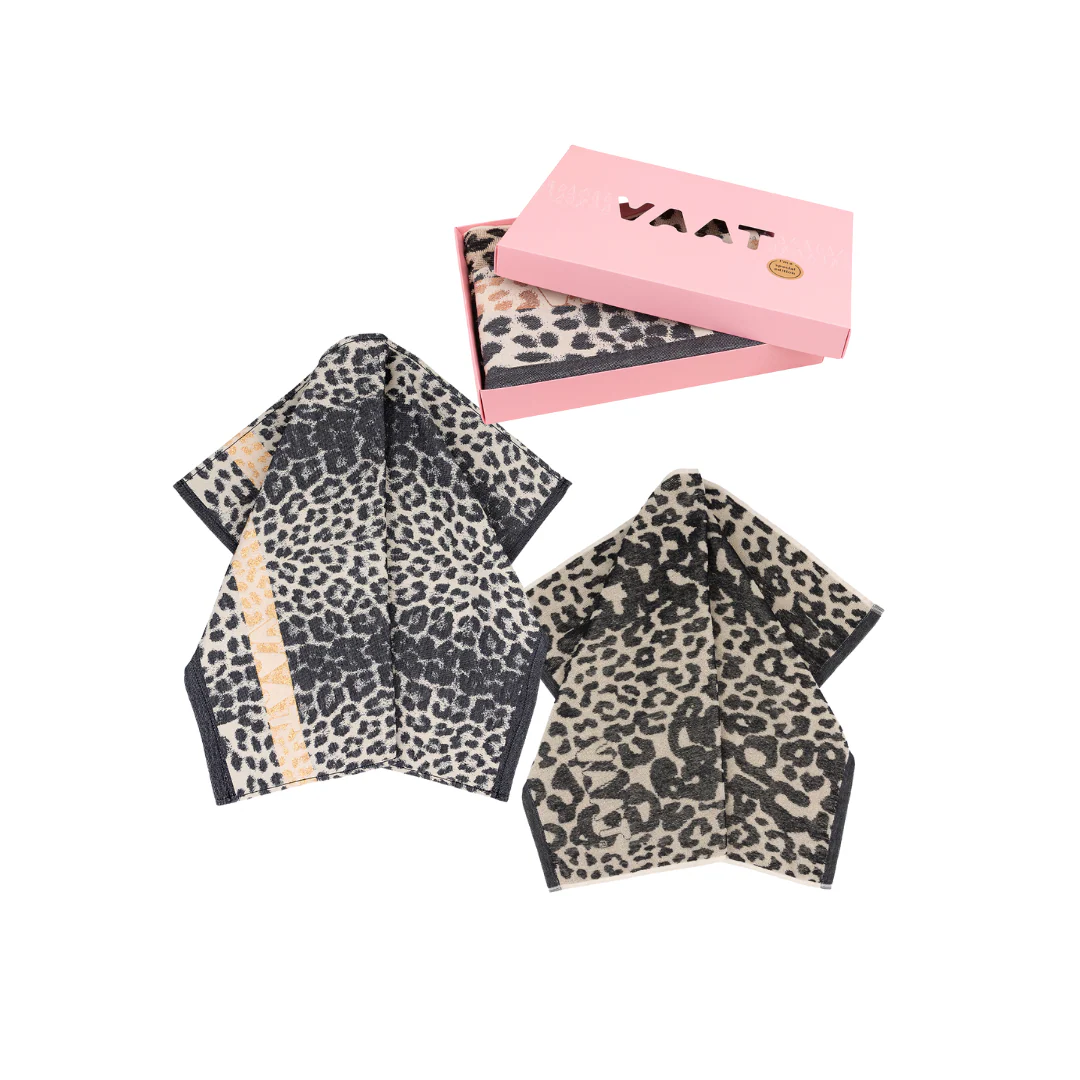 Een gift box met daarin een thee- en keukenhanddoek met ingeweven leopard-dessin — een no-brainer als je het ons vraagt.