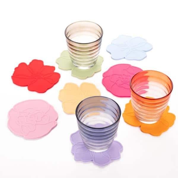 De onderzetters zijn van siliconen, dit is ideaal omdat het hittebestendig en antislip is. Door het reliëf van de bloem blijft het niet vacuüm zuigen aan een nat glas.