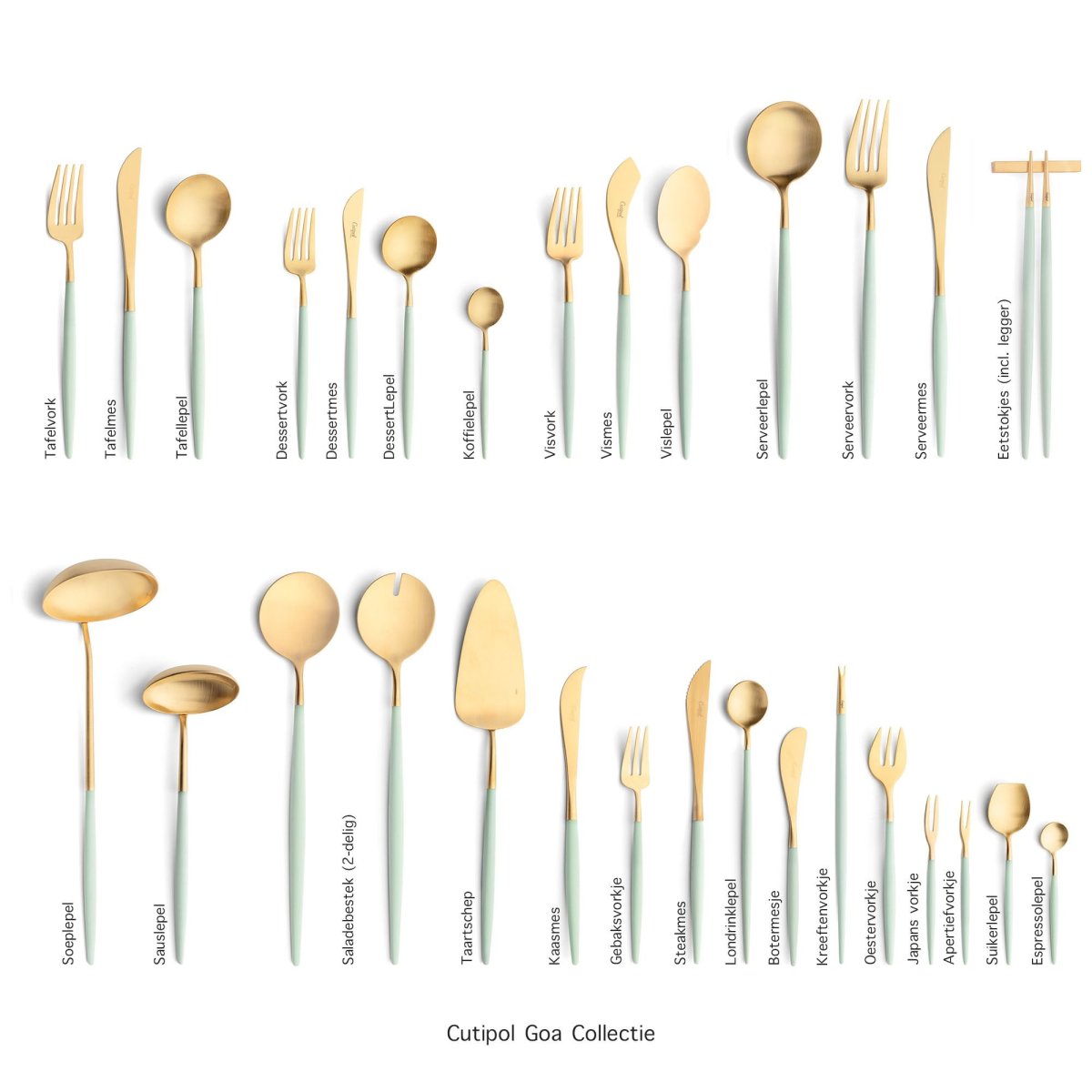 Breng luxe naar je eettafel met de Goa Celadon 24-karaat verguld bestek van Cutipol. Dit prachtige bestek combineert elegant design met exclusieve materialen en vakmanschap.