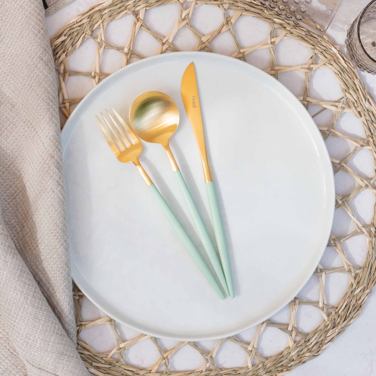 De Goa-serie staat bekend om zijn minimalistische en elegante uitstraling. De combinatie van de verfijnde celadon tint met het warme, vergulde roestvrij staal zorgt voor een moderne, luxueuze look die naadloos aansluit bij diverse serviesstijlen. -