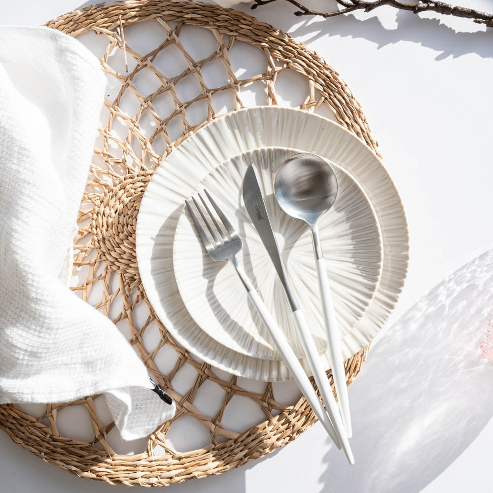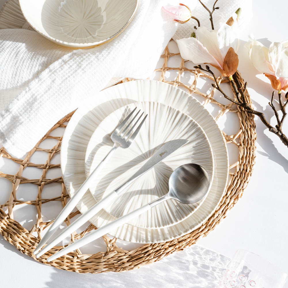 Het Goa Wit RVS Bestek is vaatwasserbestendig en behoudt zijn prachtige uitstraling, zelfs na veelvuldig gebruik. Dit maakt het een ideale keuze voor dagelijks gemak en langdurige elegantie. - Diverse besteksets beschikbaar: