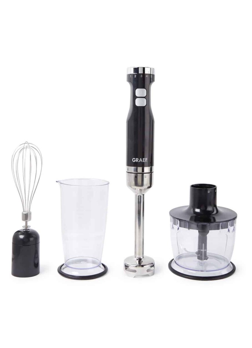 Staafmixer van Graef. De staafmixer is vervaardigd van roestvrij staal en heeft een behuizing van hoogwaardige kunststof. Het model is uitgevoerd in zwart en is veelzijdig in gebruik. Zo is de mixer geschikt om te pureren, te vermalen en te vermengen. Het apparaat beschikt over 5 snelheden en een turbo-stand. De motor heeft een vermogen van 800 Watt. De staafmixer heeft vier bladen en is voorzien van een anti-spetter functie. De mixer wordt geleverd met bijpassende accesoires: garde, hakker en kunststofbeker (70 cl). De onderdelen zijn vaatwasserbestendig.