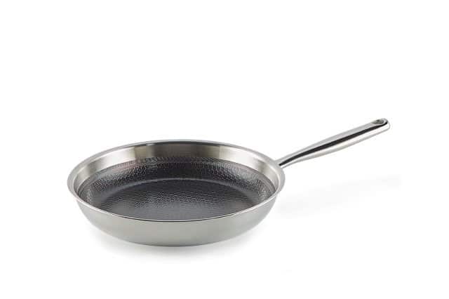 Zoals de naam al doet vermoeden is deze koekenpan uit de Habonne Hybrid lijn een hybride pan. Hybride betekend in dit geval een mix van een rvs- en een antikleefpan. De drielaags pan (tri-ply) is voorzien van een 100% PFAS vrije keramische coating. Deze coating ligt iets verdiept in het hexagon motief waardoor deze goed bestand is tegen krassen en beschadigingen. Een pan voor jaren die ook nog eens een mooie korst op je product bakt en gemakkelijk in de reiniging is. Vanzelfsprekend te gebruiken op alle warmtebronnen. 10 jaar fabrieksgarantie