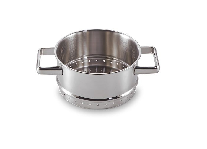 De stoominzet is uitgevoerd in hoogglans roest vrij staal. De stoominzet heeft een diameter van 16 cm en past dus perfect op de 16cm kookpan Royal. Je kan het stoominzet niet direct op een warmtebron plaatsen, het moet altijd in combinatie met een kookpan gebruikt worden, voordat deze op een warmtebron geplaatst word. Ideaal om de aardappelen onderin te koken en de groenten mee te stomen in deze mooie stoominzet. Bij het stomen van voedsel gaar je de ingrediënten gescheiden van het vocht. De hete waterdamp stroomt direct op het voedsel en omsluit het van alle kanten. Bij stomen maak je dus het eten gaar door middel van damp die vrijkomt van het kokende water.