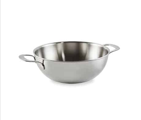De wok is vervaardigd met Triply (3 lagen materiaal) die doorlopen van bodem tot zijranden. Hierdoor is er een ideale gelijkmatige warmteverdeling en wordt de wok ook sneller warm, dus energiebesparend.
