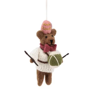 Vilten muis in een warme, blauwgroene winterjas met wollige afwerking. Een decoratieve hanger die een speels accent toevoegt aan je winter- of kerstdecoratie. Perfect om op te hangen in de kerstboom of aan een mooie tak.