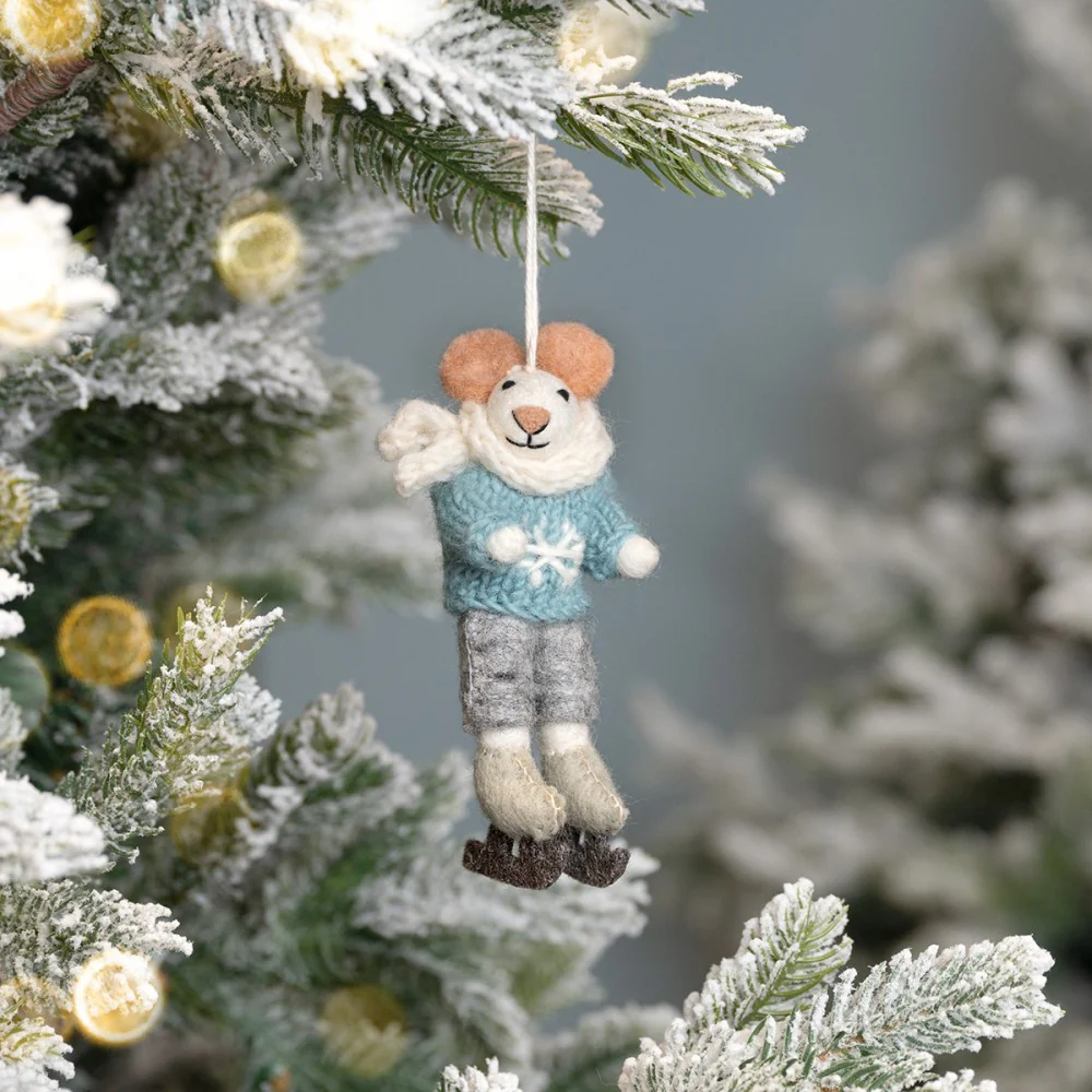 Een winterse muis met schaatsen aan zijn pootjes, klaar voor een tocht over het ijs. Met zijn ijsblauwe trui en warme sjaal straalt hij gezelligheid uit. Een bijzondere hanger voor in de kerstboom of als decoratie aan een tak.