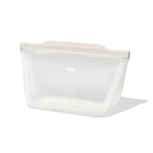Deze herbruikbare siliconen zak van OXO vervangt plastic voor eenmalig gebruik. Hij is perfect voor het bewaren van voedsel, om je lunch of snacks mee te nemen voor onderweg of om restjes in op te warmen, want hij is magnetronbestendig. De sluiting zorgt dat voedsel vers blijft en voorkomt lekken. Je kunt dus zonder zorgen sappige ananas, watermeloen of pasta mee naar je werk nemen of kebab in de koelkast marineren. De sluiting heeft een ruim lipje voor gemakkelijk openen en sluiten, en deze staande zak gaat wijd open voor eenvoudig vullen zonder knoeien.