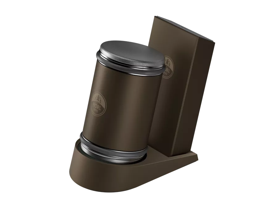 De grafietafwerking van de HORL® Dock contrasteert stijlvol met de eiken- en walnoothoezen van de HORL® 2-slijpers. In donker brons past het perfect bij de kleur van de HORL® 2 Pro.