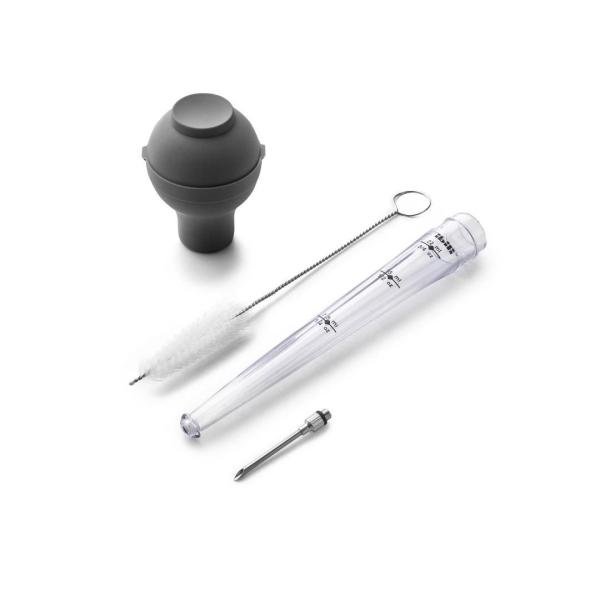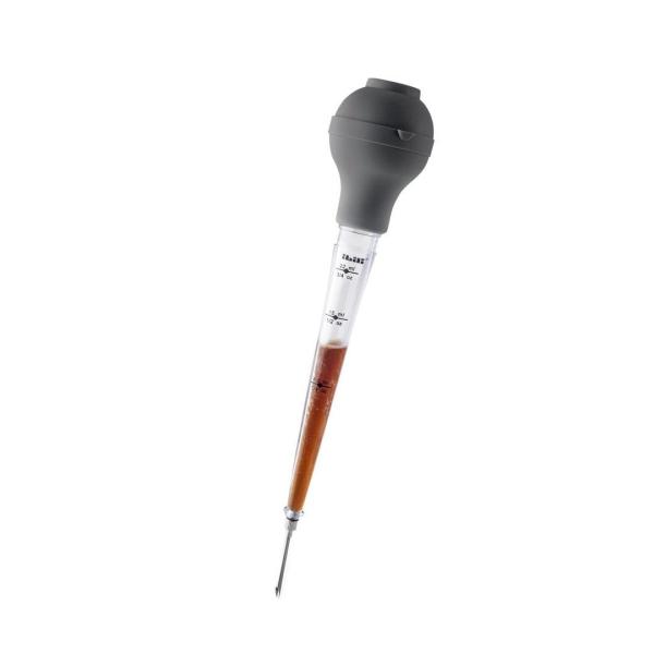 Met deze injecteur van Ibili injecteer je marinades in vlees, vis of gevogelte; extraheer je vloeistoffen en sappen; en doseer je sauzen en meer. De injecteur heeft een inhoud van 22 ml, is voorzien van een maatverdeling en heeft een zeer nauwkeurige doseerpen. Hij is gemaakt van kunststof, de doseerpen van roestvrijstaal. Deze kun je losdraaien voor schoonmaken en voor compact en veilig opbergen. Een schoonmaakborsteltje is inclusief, deze kun je in de injecteur bewaren. De injecteur is vaatwasmachinebestendig.