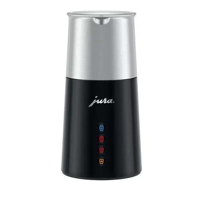 Een bijzonder hoogtepunt is de chocolademelk, die dankzij de krachtige technologie kan worden bereid met stukjes fijne chocoladereep. Het ontwerp van de melkopschuimer maakt indruk met zijn elegante en functionele vormgeving. Met slechts vier symbolen is de bediening eenvoudig en direct. De conische basis zorgt voor een stevige stand en houdt de melkhouder vast, waardoor een stijlvol en harmonieus geheel ontstaat. Met de licht gebogen schenktuit kan de opgeschuimde melk of chocolademelk precies en netjes worden ingeschonken. De melkopschuimer Hot & Cold is de ideale aanvulling op de Pure-Coffee-volautomaten van JURA en zal snel een onmisbare metgezel worden bij de koffiebereiding.