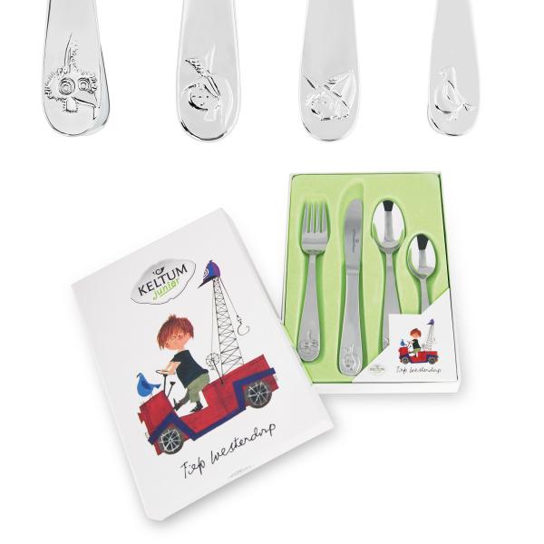 De illustraties van Fiep Westendorp zijn een dierbare jeugdherinnering voor vele generaties. Iedereen houdt van ze. Het boekomslag van het boek Pluk van de Petteflet, geschreven door Annie M.G.Schmidt, wordt beschouwd als het icoon van het Nederlandse kinderboek. Pluk rijdt in zijn rode kraanwagen en woont in het torenkamertje van de Petteflet. Samen met zijn vriendjes beleeft hij steeds weer nieuwe avonturen. Pluk, zijn vriendinnetje Aagje, Dollie de duif en de krullevaar staan afgebeeld op dit 4-delig kinderbestek van Keltum Junior. Inspiratie genoeg voor fantastierijke verhalen aan tafel.