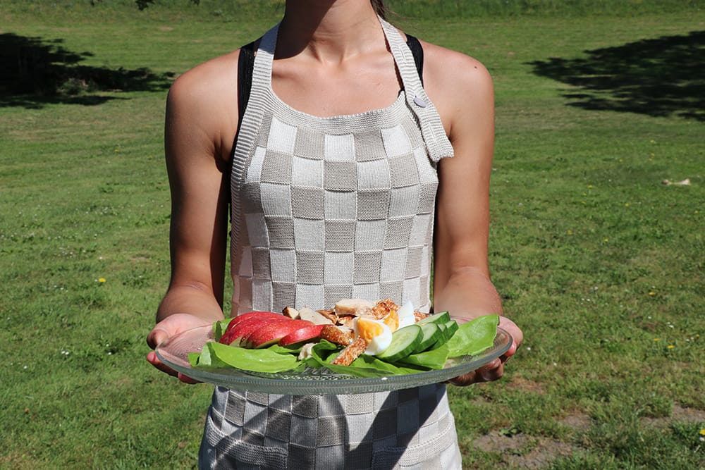 Knit-Factory Keukenschort maakt koken nog leuker! Het smaakvolle, gebreide schort, heeft diepe zakken, zodat je je keukengerei en een handdoekje altijd bij de hand hebt. Dankzij de tailleband en verstelbare neksluiting past het schort altijd en is je kleding goed beschermd tegen vlekken. Het zachte breiwerk van het geblokte keukenschort bestaat uit katoen en acryl. Daardoor is het schort sterk en duurzaam en kan je er lang van genieten.