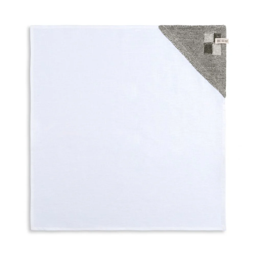 Materiaal: 100% linnen doek, gebreide hoek is 50% katoen, 50% acryl.