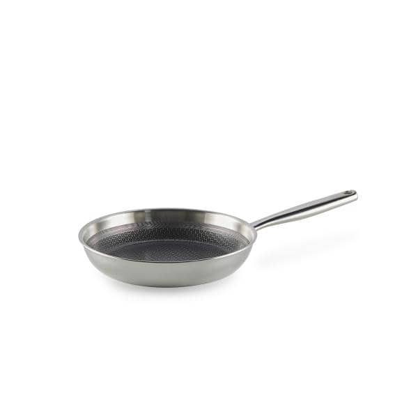De Habonne Hybrid koekenpan is een echte allrounder in de keuken. Dankzij de Triply constructie (RVS – aluminium – RVS) warmt de pan snel en gelijkmatig op, waardoor je perfecte controle hebt bij het bakken. Het unieke honingraatprofiel beschermt de PFAS-vrije keramische antikleeflaag en zorgt voor een knapperig bakresultaat, ideaal voor vlees, vis en groente.