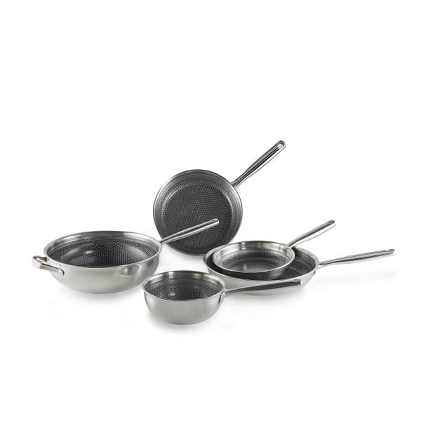 Wat deze pannen bijzonder maakt, is de unieke PFAS-vrije keramische antikleeflaag die extra versterkt is met een honingraatstructuur. Dit stalen reliëf ligt net boven de antiaanbaklaag en beschermt deze tegen krassen. Daardoor zijn de pannen duurzaam in gebruik en kun je zelfs met metalen spatels werken, al blijft het aan te raden om siliconen of houten hulpmiddelen te gebruiken. De honingraat zorgt bovendien voor een mooie verdeling van vet en warmte, wat een gelijkmatig bakresultaat geeft en helpt om ingrediënten echt krokant te bakken.