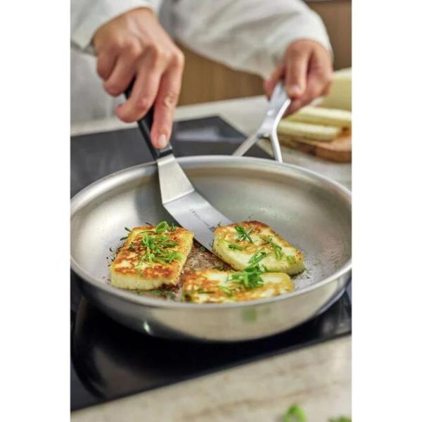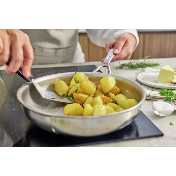 Of je nu vlees, vis of groenten wilt bakken, met de Silverline 7 pan heb je maar één pan nodig. Dankzij de innovatieve NanoTouch technologie hoef je je geen zorgen te maken over een antiaanbaklaag. De Silverline 7 bakpan is volledig vervaardigd uit ons exclusieve 7-lagenmateriaal, wat zorgt voor een snelle en gelijkmatige warmteverdeling. Het unieke bakoppervlak met de exclusieve NanoTouch structuur maakt bakken in roestvrij staal eenvoudig en effectief. Of je nu magere kip, een sappig stuk zeebaars of knapperige aardappeltjes wilt bereiden, de micro-oneffenheden in het oppervlak zorgen voor een optimale verdeling van vetstoffen, zelfs bij minimale hoeveelheden. Deze 24 cm pan ligt comfortabel in de hand en presteert uitstekend op elk type fornuis, met name op inductie. Dankzij de exclusieve TriplInduc®-technologie bak je op inductie efficiënter en met precieze temperatuur controle, waardoor je tot wel 30% energie bespaart. Zodra de pan de juiste temperatuur heeft bereikt, kun je het fornuis lager zetten, terwijl de pan de ideale baktemperatuur behoudt. Heb je de neiging om met mes en vork in je pan te snijden? Geen zorgen, deze robuuste bakpan met NanoTouch bodemstructuur kan daar uitzonderlijk goed tegen. Dankzij onze unieke lastechnologie is de steel stevig en hygiënisch bevestigd. Bovendien blijft de pan dankzij de Silvinox® oppervlaktebehandeling moeiteloos schoon en glanzend, zelfs na talloze wasbeurten in de vaatwasser. De Silverline 7 staat garant voor jarenlang bakplezier en is jouw trouwe assistent in de keuken.