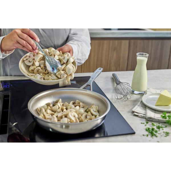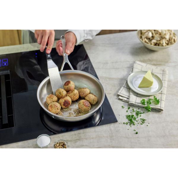 Of je nu vlees, vis of groenten wilt bakken, met de Silverline 7 pan heb je maar één pan nodig. Dankzij de innovatieve NanoTouch technologie hoef je je geen zorgen te maken over een antiaanbaklaag. De Silverline 7 bakpan is volledig vervaardigd uit ons exclusieve 7-lagenmateriaal, wat zorgt voor een snelle en gelijkmatige warmteverdeling. Het unieke bakoppervlak met de exclusieve NanoTouch structuur maakt bakken in roestvrij staal eenvoudig en effectief. Of je nu magere kip, een sappig stuk zeebaars of knapperige aardappeltjes wilt bereiden, de micro-oneffenheden in het oppervlak zorgen voor een optimale verdeling van vetstoffen, zelfs bij minimale hoeveelheden. Deze 28 cm pan ligt comfortabel in de hand en presteert uitstekend op elk type fornuis, met name op inductie. Dankzij de exclusieve TriplInduc®-technologie bak je op inductie efficiënter en met precieze temperatuur controle, waardoor je tot wel 30% energie bespaart. Zodra de pan de juiste temperatuur heeft bereikt, kun je het fornuis lager zetten, terwijl de pan de ideale baktemperatuur behoudt. Heb je de neiging om met mes en vork in je pan te snijden? Geen zorgen, deze robuuste bakpan met NanoTouch bodemstructuur kan daar uitzonderlijk goed tegen. Dankzij onze unieke lastechnologie is de steel stevig en hygiënisch bevestigd. Bovendien blijft de pan dankzij de Silvinox® oppervlaktebehandeling moeiteloos schoon en glanzend, zelfs na talloze wasbeurten in de vaatwasser. De Silverline 7 staat garant voor jarenlang bakplezier en is jouw trouwe assistent in de keuken.