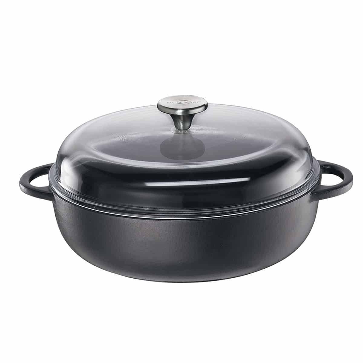 Met deze gietijzeren hapjespan kan u uw gerecht heerlijk laten sudderen en door de glazen deksel kan u het gehele proces volgen. Gietijzer leent zich echter niet alleen om te sudderen, ook bereidingen op hoge temperaturen is geen probleem en zelfs kan de pan in de oven tot 250 graden. De hapjespan leent zich uitstekend voor al uw eenpansgerechten en is ook ideaal voor het braden van vlees zoals gehaktballen en rollades. De pan kan op elke warmtebron gebruikt worden maar dient met de hand te worden afgewassen (zoals elke gietijzeren pan). De deksel kan wel gewoon in de vaatwasser.