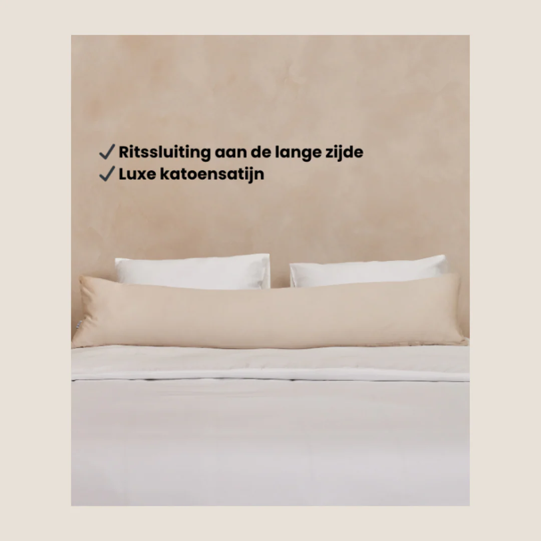 Omhul je slaapmaatje met een katoensatijnen hoes met handige rits aan de lange zijde, in warm wit, beige of groen. Een luxe stof die bijdraagt aan een fijne slaapplek. Zo blijft de stof lekker koel aanvoelen, is het zacht voor huid en haar en neemt het vocht goed op.