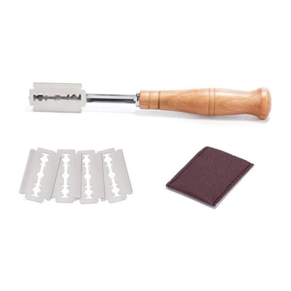 De set wordt geleverd met vijf vervangbare mesjes en een luxe lederen beschermhoes, zodat je het mesje veilig kunt opbergen.