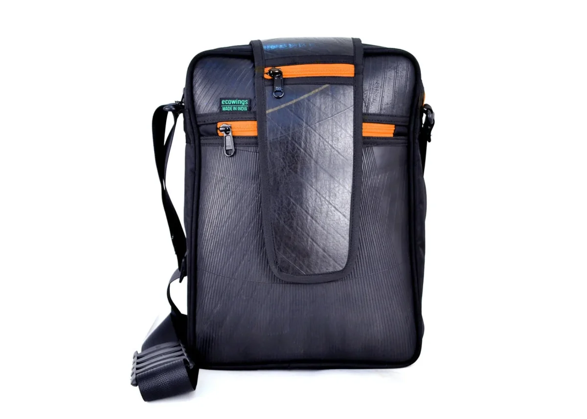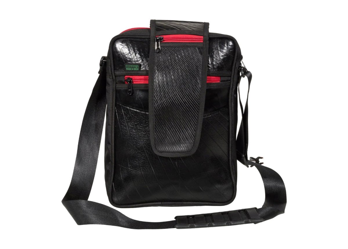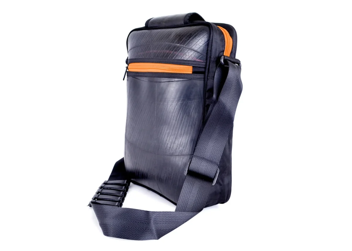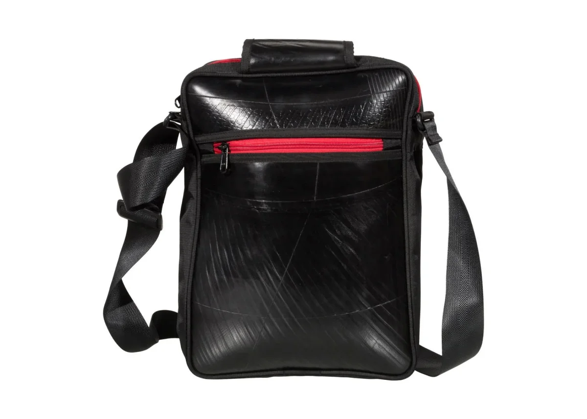 Slank en stijlvol, zo laat de handgemaakte Elephanta Laptop Schoudertas van geupcyclede binnenband zich het best omschrijven. Maar multifunctioneel is hij ook. Met slimme vakken aan de voor- en achterkant die je afsluit met een robuuste rits, een ruim hoofdvak voor het veilig vervoeren van je 14” laptop of tablet en insteekvakken voor accessoires.
