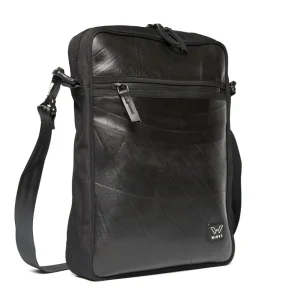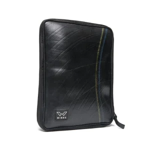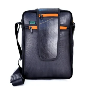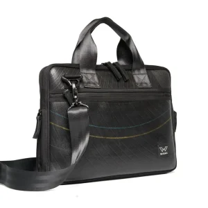 Deze handgemaakte laptoptas van upcyclede vrachtwagen-binnenbanden heeft waterdichte ritsen en een verstevigde bodem. Al je elektronica zoals een 16 tot 17” laptop of tablet vervoer je er veilig mee en in de vele vakken met ritsen kun je papieren, pennen, nietmachines, perforators en andere kantoorbenodigdheden kwijt. De afneembare en verstelbare schouderriem is vervaardigd van een geupcyclede autoriem.