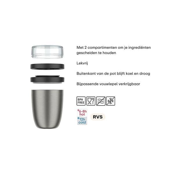Neem voor onderweg de isoleer lunchpot Ellipse mee met frisse yoghurt en granola (handig, want die blijft lekker knapperig in de deksel!). In de dubbelwandige pot blijft je yoghurt lekker koel, zelfs tot de lunch! In de trein of op je werk alleen nog even mixen en… klaar. Avonddienst, school of sportles zonder magnetron op locatie? Geen probleem: warm thuis een soepje op, giet ‘m in de lunchpot, croutons in de deksel… et voilá, zelfs na een paar uur nog een lekker warme maaltijd! Deze yoghurtbeker houdt je eten tot 6-8 uur* warm en tot 12 uur koud. Natuurlijk is de isoleerpot lekdicht en blijft de buitenkant koel en droog, hoe warm of koud de inhoud ook is. Beide compartimenten hebben hun eigen deksel, die op en van elkaar gehaald kunnen worden met een simpele twist. De deksel van de isoleer lunchpot heeft ook een isolerende functie en kan dus niet zomaar gewisseld worden met de deksel van onze reguliere yoghurtbeker. Om zolang mogelijk van je product te kunnen genieten raden wij aan de thermoslunchpot met de hand af te wassen. De kunststof onderdelen van de dop mogen wel gewoon in de vaatwasser.