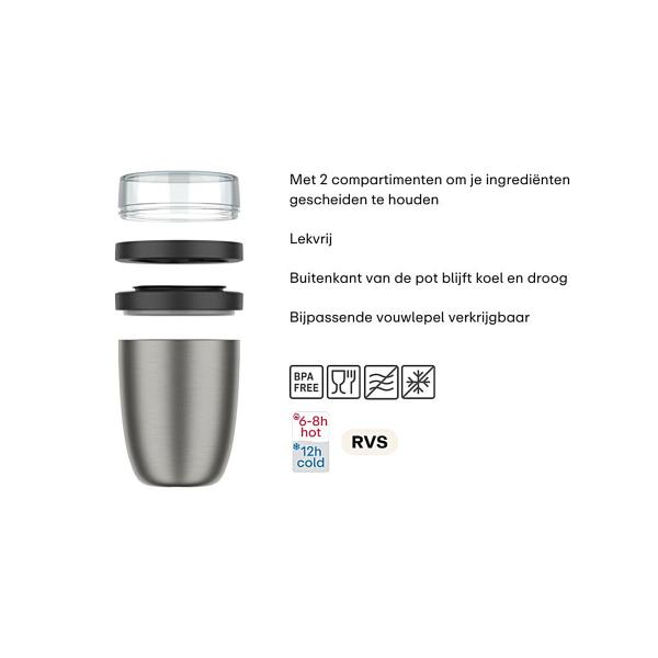 Een compartiment van 500 ml (isolerend) en 200ml (niet isolerend) zo blijft de inhoud gescheiden