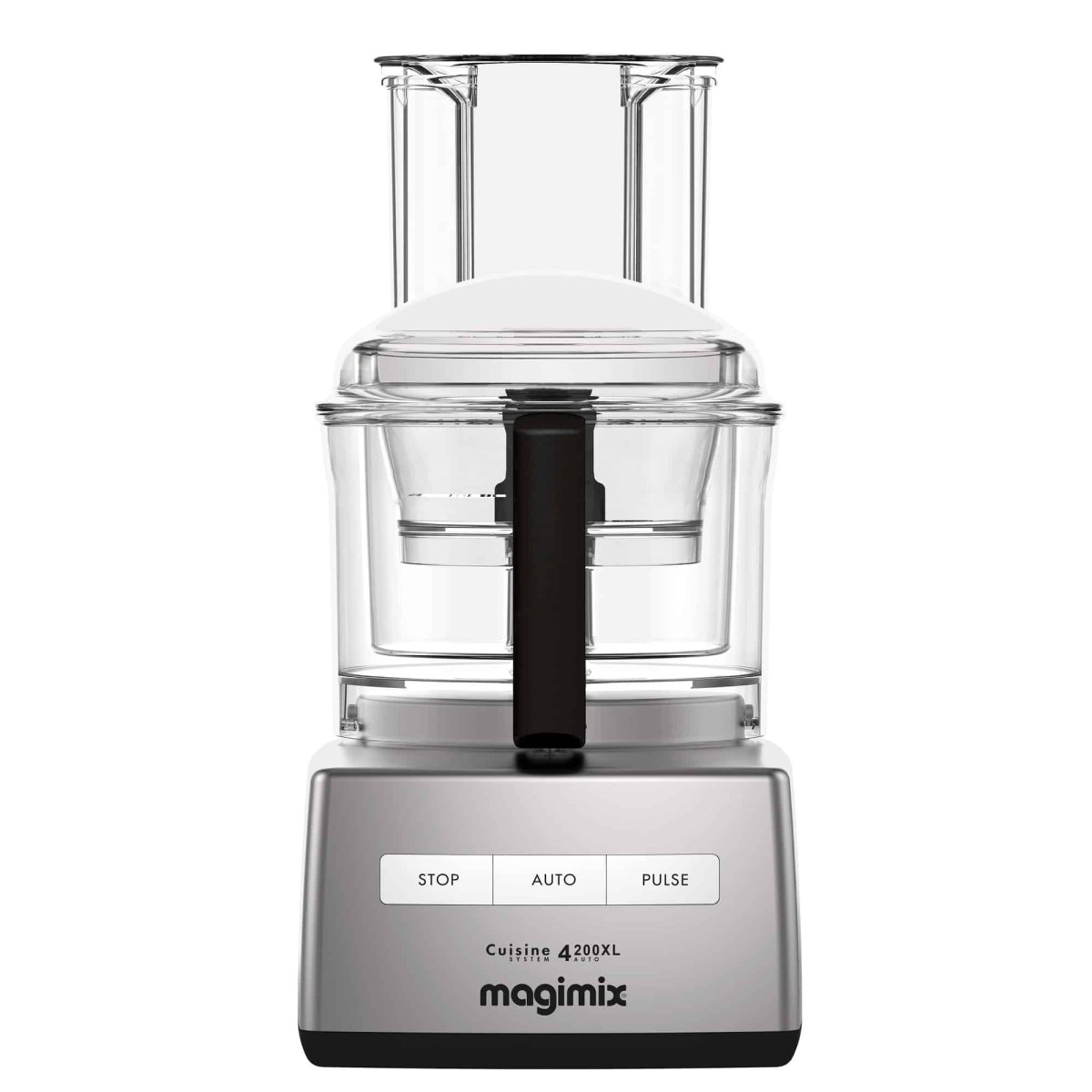 Magimix 4200xl mat chroom Multifunctionele keukenmachine, die automatisch ingrediënten op een juiste snelheid [1700 toeren] snijdt, mengt, raspt, schaaft, maalt zodat het meest optimale eindresultaat verkregen wordt. Tevens kan de machine gebruikt worden voor kneden van deeg, het maken van alle vruchten- en groentesappen. De professionele keukenhulp voor thuisgebruik. Foodprocessor 1-6 personen Vermogen 900 Watt Inhoud mengkom 3 ltr, cakemix 900 gr, brooddeeg 1000 gr, eiwitten 6 stuks, soep 1,3 ltr Afmetingen 210 x 260 x 390 mm 12 jaar garantie op de inductiemotor 2 jaar garantie overige onderdelen Inclusief minimengkom, minimes, midimengkom, stalen mes, deegmes(vernieuwd ontwerp, luchtiger deeg), eiwitklopper, spatel, opbergdoos, receptenboek 2 mm plakjes-raspschijf, 4 mm plakjes-raspschijf.