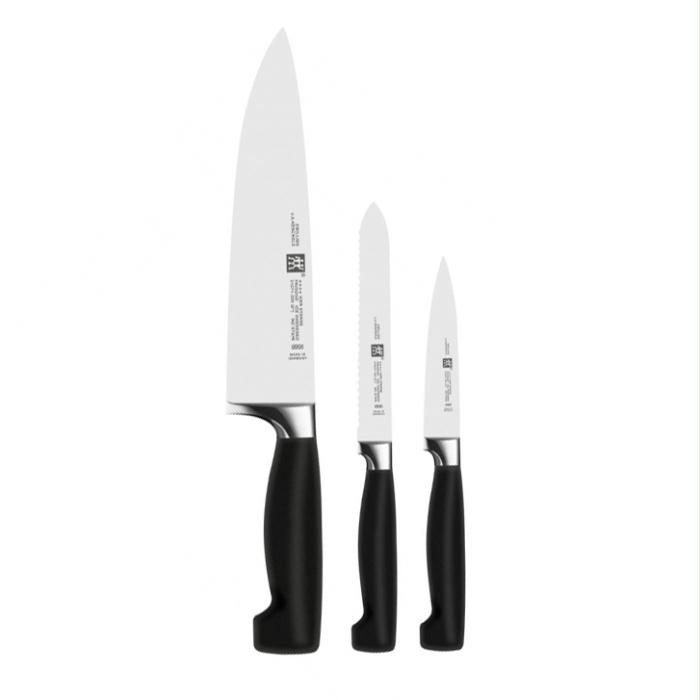 Deze handige, veelzijdige driedelige messenset of ZWILLING hoort thuis in de keuken van iedere hobbykok en professional. De Four Star reeks combineert kwaliteit met traditie en innovatie, en is daardoor een van ’s werelds meest verkochte messenreeksen. Het SIGMAFORGE mes is gemaakt uit één stuk staal en werd volgens een innovatief procedé uitgehard in ijs. Dat maakt het mes namelijk niet alleen beter bestand tegen corrosie, maar ook duurzamer. Van optimale snijeigenschappen gesproken! Dit klassieke mes is de ultieme combinatie van traditie en innovatie. Deze driedelige messenset bevat een licht schil- en garneermes. Het dunne lemmet van dit mes versnijdt niet alleen groenten en fruit in een handomdraai, maar ook vlees. Het middelgrote universele mes is dan weer bijzonder veelzijdig. Vlees, kaas en andere koude voedingswaren versnijden wordt zo kinderlijk eenvoudig. Het zware, stevige koksmes met breed lemmet is dé allrounder van alle ZWILLING messen. De plastic greep zonder naden heeft een ergonomische vorm voor nauwkeurig gebruiksgemak op elk moment. Deze Four Star messenset is een exclusieve, professionele aanwinst voor uw keuken. Koken was nog nooit zo leuk!