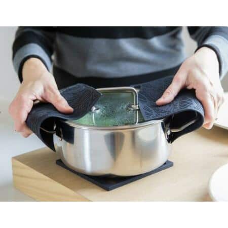 Dankzij de flexibiliteit en grip kun je ze ook gebruiken om potten open te maken. Het fijne blad motiefje en maakt de pannenlap ook nog eens extra mooi.