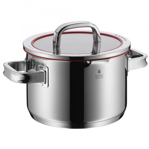 WMF Function 4, een trendy ontwerp met een innovatieve functionaliteit: de siliconen rand onder de glazen deksel en de 4 verschillende openingen maken deze serie uniek en zeer prettig in gebruik. Afgieten zonder dat je de heet geworden deksel er dus hoeft af te halen! Deze pannenset is ideaal voor de type afzuigkap met downdraft (afzuiger in het midden van de kookplaat en geen kap boven het fornuis).