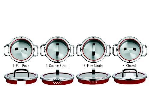 - pan heeft 4 standen: dicht, grote opening (snel afgieten), opening met kleine en grote zeef voor afgieten van bijvoorbeeld rijst op spaghetti.