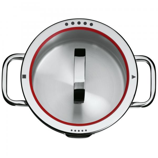 Met de rode siliconenrand in de deksel kun je de stoomuitlaat bijna volledig afsluiten. Dat betekent dat het toegevoegde laagje water grotendeels in de pan blijft. En dus kun je ook met veel minder water toe.