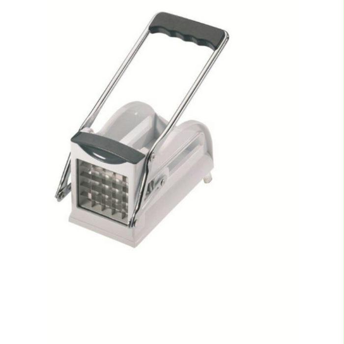 De fritessnijder heeft een stevige stalen handel en een body uit wit kunststof.